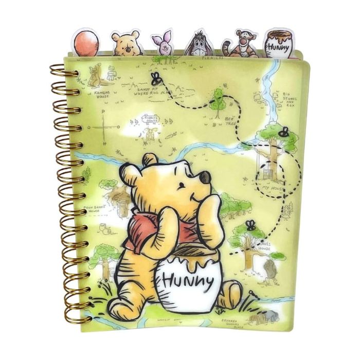 - Features lined pages with color images of Pooh Bear on the corners, 6 color illustrated section dividers, and tab dividers.